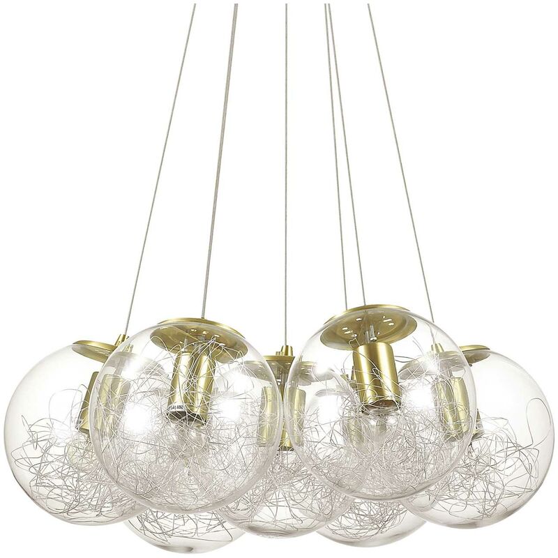 Lampada a sospensione ottone D 600 x H min 450 - max 1400 mm Caratteristiche: Lampadina inclusa=No Kit fissaggio=No Attacco lampada=E27 Volt=220-240 V AC Watt=E27 max 7 x 60W Finitura=ottone Colore rosone=nickel Materiale=Metallo,Vetro Dimensioni= D 600 x H min 450 / max 1400 mm