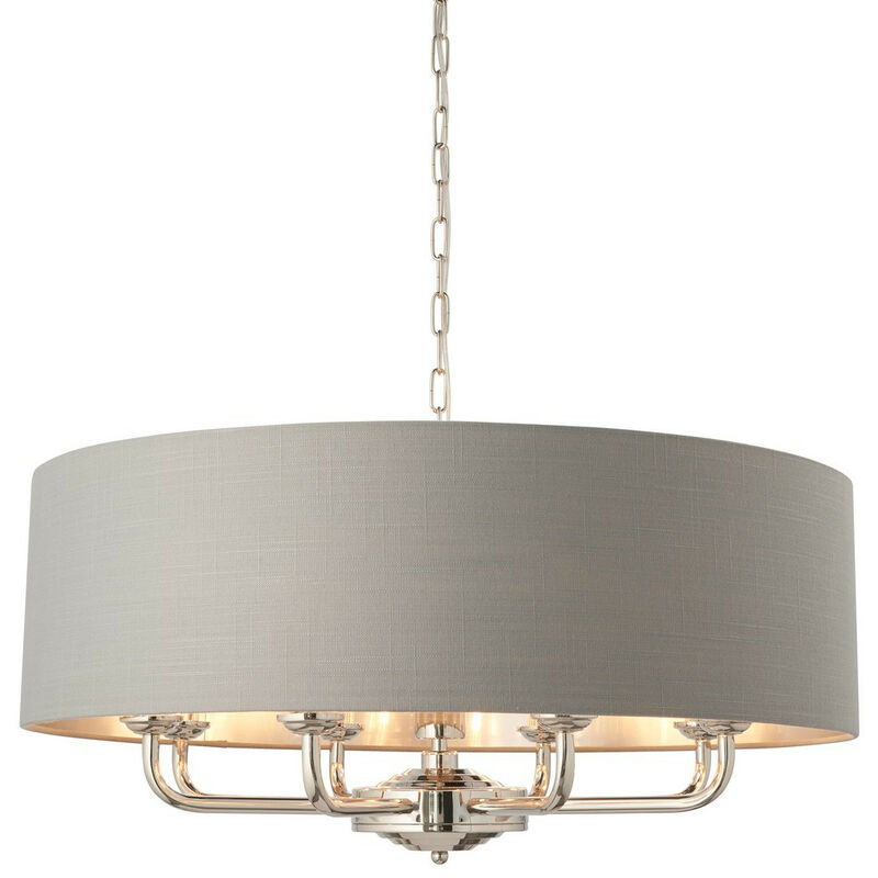 Lampada a sospensione con paralume singolo in nichel lucido, tessuto antracite | Finitura: piastra in nichel brillante e tessuto antracite | Materiale: tessuto e acciaio | Altezza minima (cm): 55,00 | Altezza massima (cm): 173,00 | Tipo di lampada: E14 | Numero di luci: 8 | Grado IP: IP20 | Lampadina inclusa: No | Potenza (max): 40W | Peso (kg): 3.68