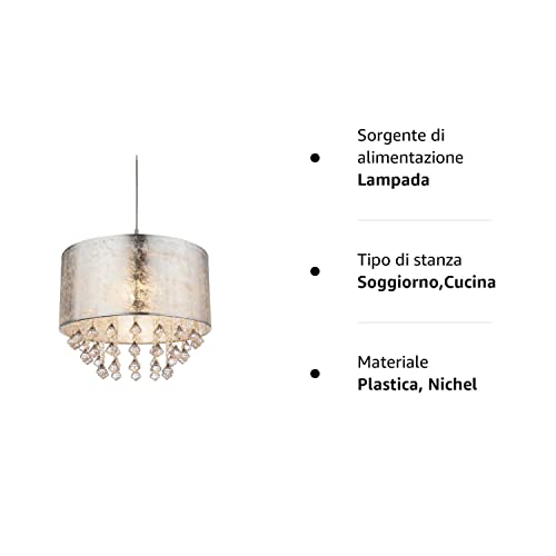 Lampadario a sospensione. Materiale: Nichel opaco. Tessuto: colore nichel opaco e argento metallizzato. Lampadina: 1 x E27 da 60 Watt (non inclusa). Incluso supporto per sospensione. Dimensioni: circa 40 x 140 cm.