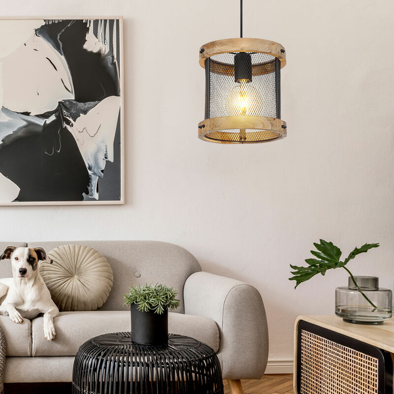 Descrizione Questa lampada a sospensione senza tempo colpisce per il suo bel design e diventerà il punto focale della tua zona giorno. La lampada è composta da 3 prese E27 con un paralume formato da due telai in legno e una rete metallica (Ø 40 cm) che pende a 1,2 m dal soffitto su un cavo nero. Con le prese E27 puoi decidere tu stesso la scelta del tuo illuminante fino a una potenza massima di 40 watt. La lampadina non è inclusa nella fornitura. Particolare lampada • Tipo di lampada: lampada a sospensione • Materiale: metallo, legno • Colore: nero, marrone • Griglia • Classe di protezione: 1 • Grado di protezione: IP20 • Diametro x altezza in cm: 40 x 120 • Presa: 1x E27 • Lampadina inclusa: n • Potenza lampada: max 1x 40 watt • Alimentazione: 230V, 50Hz