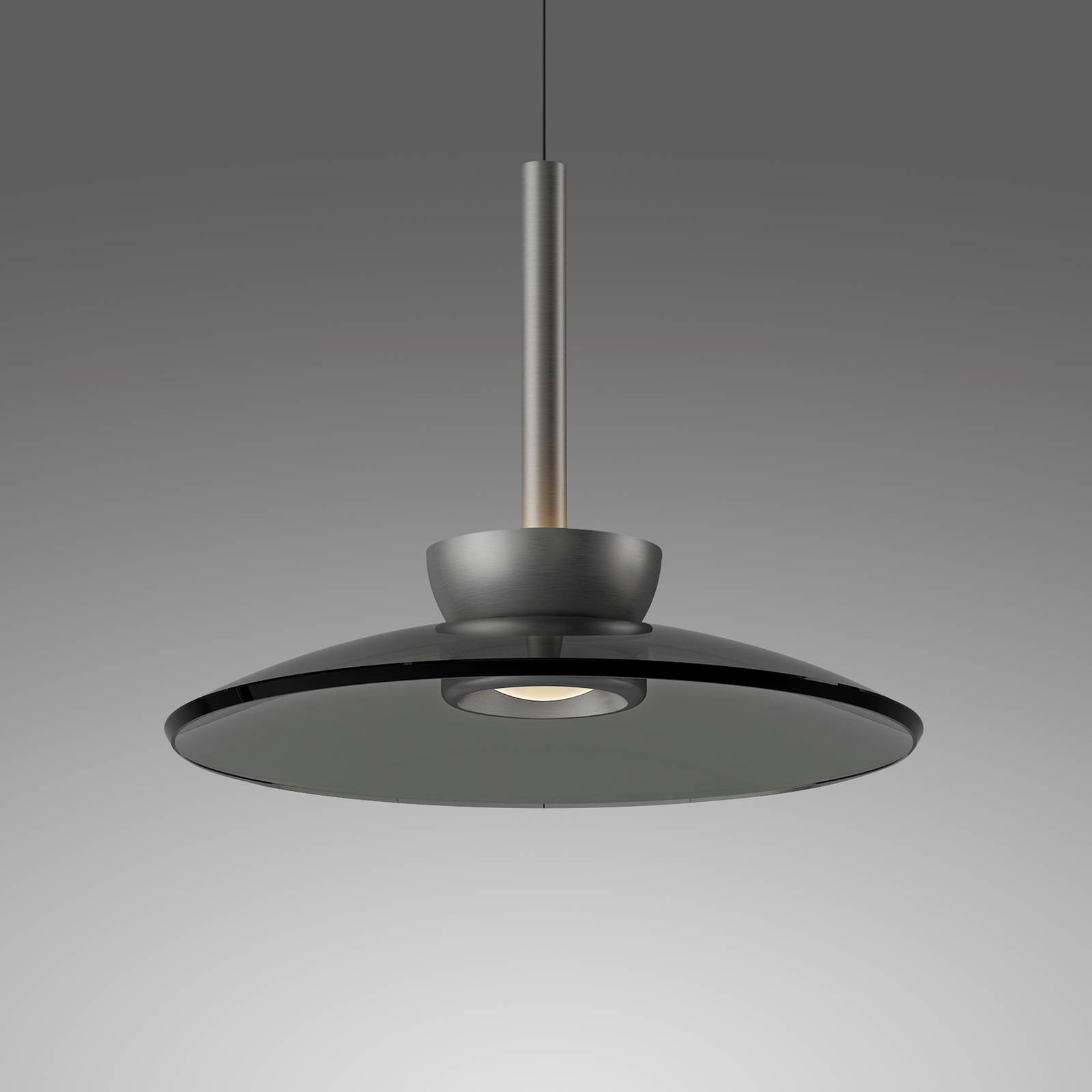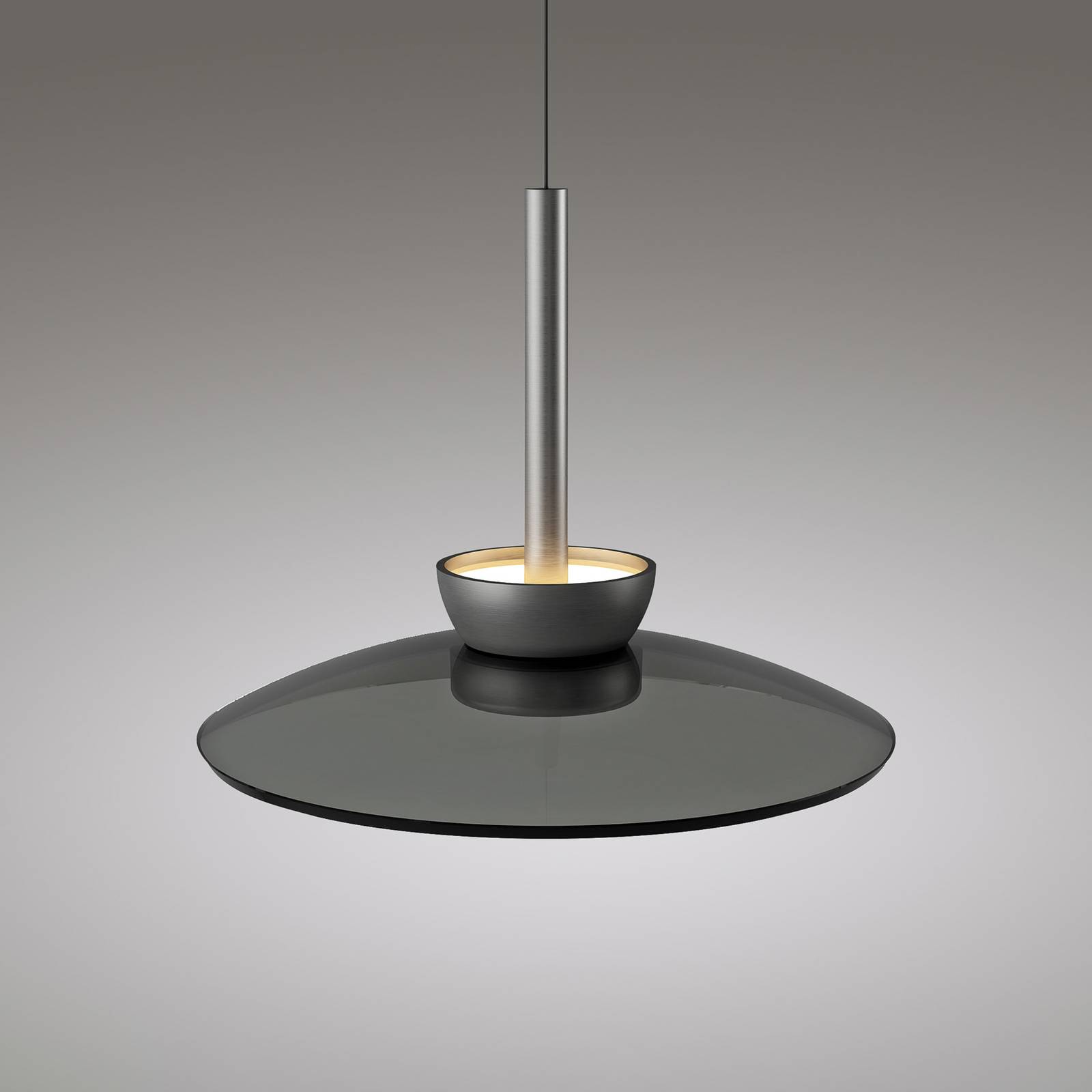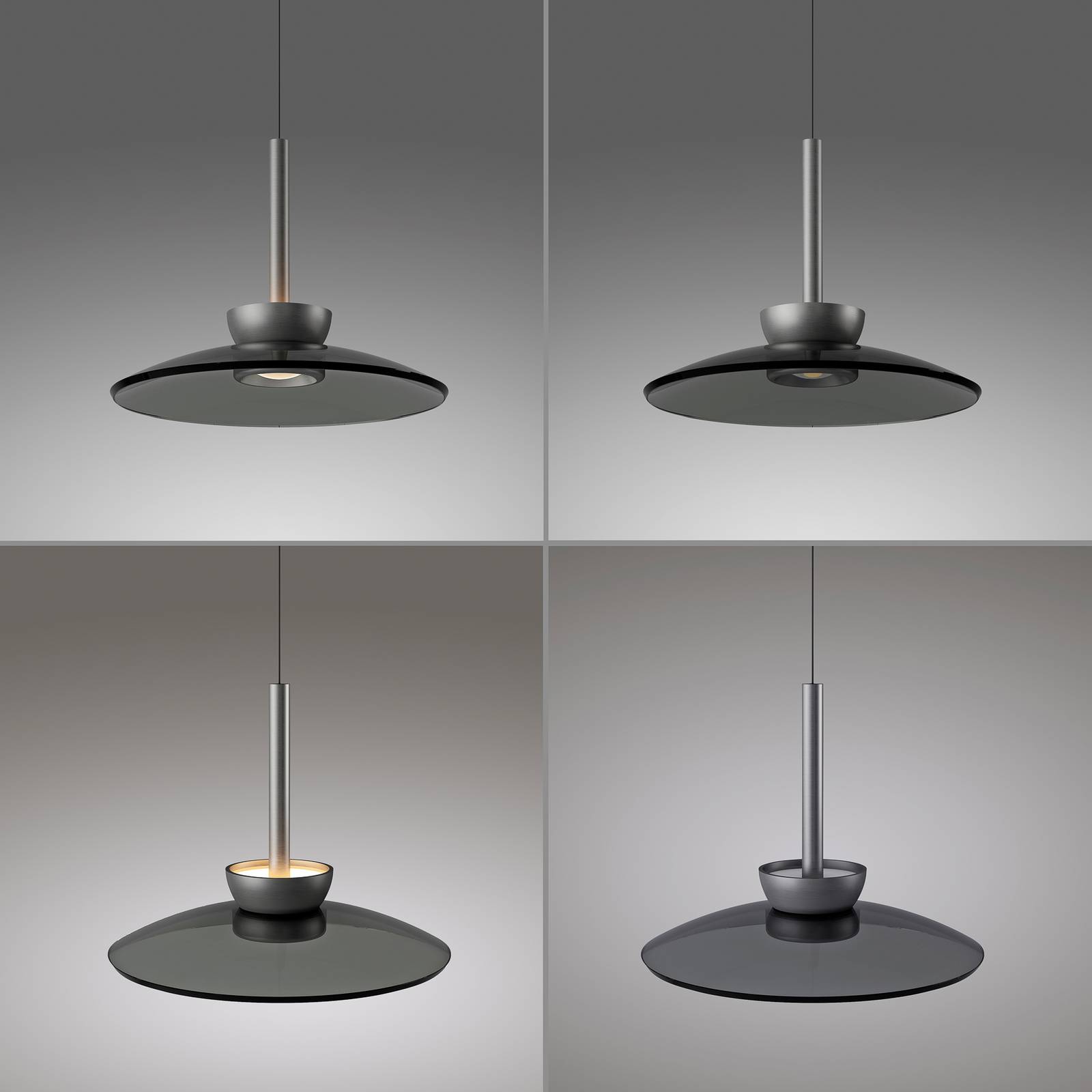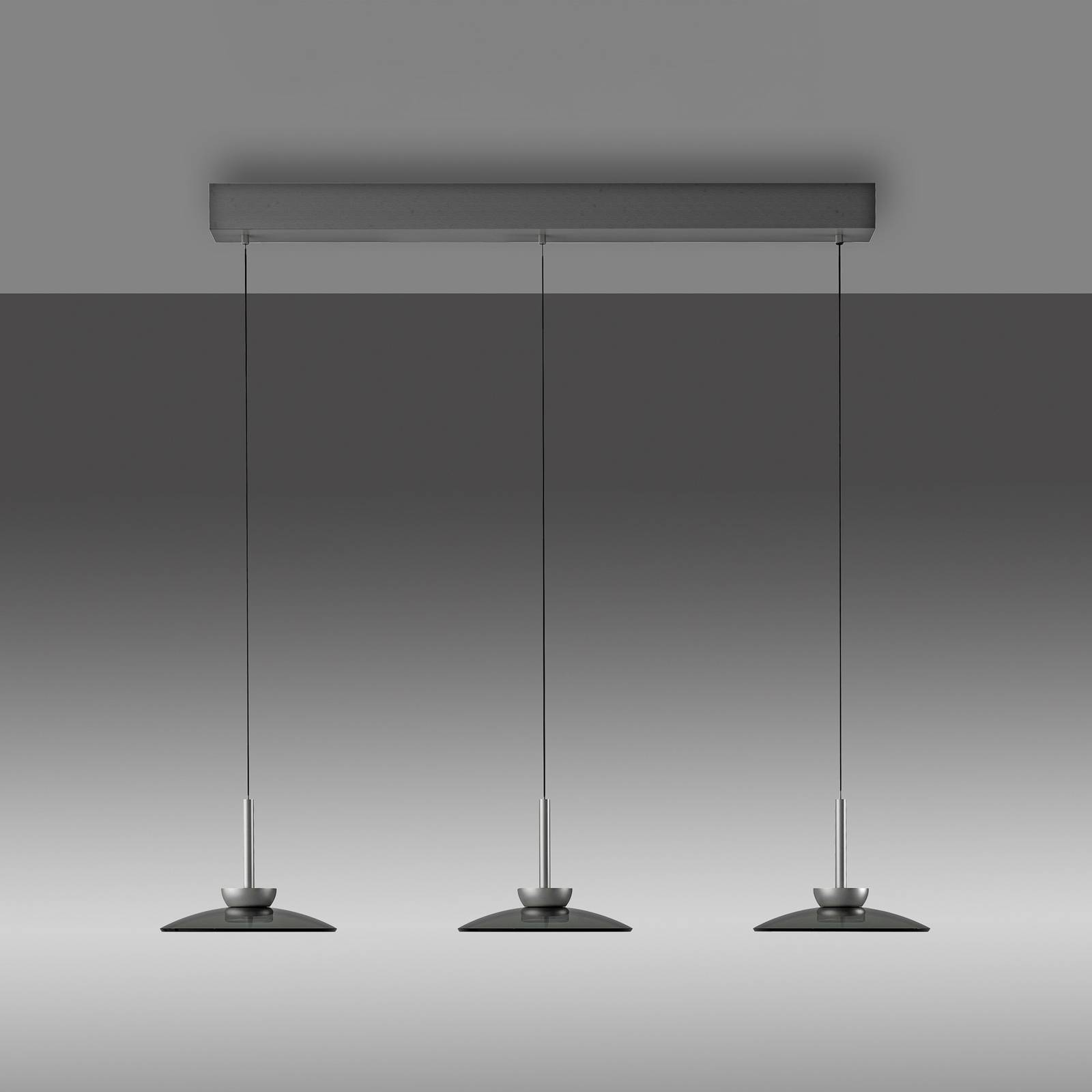 Lampada LED a sospensione Moon con tre paralumi in vetro curvato - regolabile in altezza e dimmerabile La lampada a sospensione Moon a 3 luci vanta un design elegante che si armonizza con numerosi concetti di arredamento moderno. Tre paralumi in vetro di forma rotonda, piatta e curvata verso l'alto sono appesi a sottili cavi sotto un lungo rosone. Al centro di ogni paralume si trova un corpo rotondo in alluminio che ospita un modulo LED che brilla verso l'alto e uno che brilla verso il basso. La luce bianca calda fornisce un'illuminazione diretta e indiretta dell'ambiente. La luminosità può essere controllata esternamente con un dimmer Tronic, mentre Comfort Lift permette di regolare meccanicamente l'altezza.