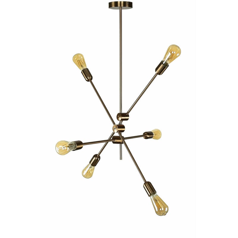 Dettagli del prodotto Materiale: Metallo Dimensioni: larghezza: 500 mm, profondità: 740 mm, profondità di sospensione: 740 mm, diametro: 500 mm Attacco: 6x E27 fino a 60W Classe di protezione dagli spruzzi: IP20 Colore: Ottone Peso: 2000 grammo Descrizione del prodotto Non passerà inosservata! L'elegante lampada a sospensione in ottone diffonde un tocco puro in qualsiasi stanza e allo stesso tempo consente un'illuminazione generosa. Grazie al giunto è adatto anche per il montaggio su tetti inclinati. Il design è ispirato ai vecchi satelliti Sputnik e rende la lampada a sospensione un elemento decorativo in ogni sala da pranzo e soggiorno. Senza paralume: cambia il look speciale con lampadine di design, luminosità e temperatura del colore a scelta, ad esempio una lampadina Edison o una lampadina rotonda (attacco E27, non inclusa) La lampada a sospensione è già premontata e può essere regolata tramite dimmer esterno e lampadine adatte (non incluse).