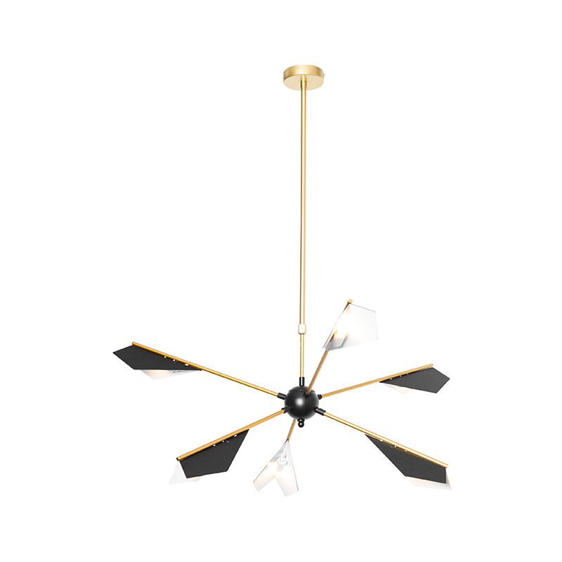 QAZQA Lampada a sospensione di design nera con oro 6 luci - Sinem Un vero e proprio colpo d'occhio, anche quando la luce è spenta! Questa lampada a sospensione Sinem è rifinita con una struttura dorata e nera: una combinazione di stile. È una bellissima lampada per il soggiorno, sopra il tavolo da pranzo o nel corridoio. La lampada da tavolo ha un'altezza totale di 125 cm e un diametro di 93 cm. La piastra di montaggio ha un diametro di 10 cm. Attenzione: questa Sinem viene fornita senza lampadine: ordina autonomamente 6 lampadine LED G9 da max. 28W. Stai cercando un vero e proprio colpo d'occhio con un tocco di design? Allora scegli questa Sinem! Portalampada: G9 . Max 6 x 28 W, 230 V Adatto a: LED, Algogene Voltaggio: 220V/230V IP Classe di protezione: [IP20] A prova di polvere Funzioni extra: Regolabile: Dimmer escluso,No, senza cavo e spina Lampadine exclusiva Il QAZQA Lampada a sospensione di design nera con oro 6 luci - Sinem è Oro/Ottone. Gli spazi abitativi adatti per questa