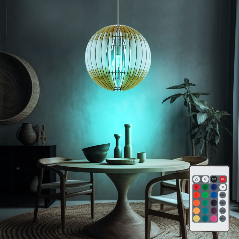 Descrizione Lampada a sospensione con design a stecche in naturale bianco. Questa lampada con un paralume bianco naturale fornisce quel qualcosa in più. In questo modo valorizzi visivamente ogni stanza e le dai un tocco corrispondente. Utilizzando il telecomando in dotazione, la lampadina LED RGB può essere passa a colori diversi e garantisce così un'illuminazione d'atmosfera. On RGB è inclusa la lampadina LED con telecomando per la luce bianca e il controllo RGB. Dettagli luce • Tipo di lampada: lampada a sospensione• Materiale: metallo, legno • Colore: naturale, bianco• Design lamella • classe di protezione: IP20 • diametro x altezza in cm: 40 x 120 • attacco: 1x E27 • lampadina inclusa: Sì • potenza della lampadina: 1x 9 watt• Flusso luminoso: 1x 806 lumen• Colore della luce: bianco caldo• Telecomando: solo per l'illuminante LED RGB • Alimentazione: 220-240V, 50-60Hz Dettagli lampadina • Tipo di sorgente luminosa: RGB-LED • Attacco: E27 • Materiale: metallo argento