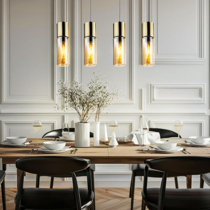 Descrizione La lampada a sospensione in ottone opaco Annika colpisce per la sua semplicità ed eleganza. Le quattro lampade cilindriche si inseriscono perfettamente negli spazi abitativi moderni. I paralumi sono in vetro color ambra e quando accendi la lampada puoi vedere le lampadine brillare molto delicatamente. Questi paralumi sono appesi a un'asta di metallo lunga 80 cm. Soprattutto come lampada sopra un bancone o un tavolo da pranzo, questo modello attira davvero l'attenzione e una fonte di luce contemporanea. Le lampadine possono essere regolate tramite uno speciale interruttore a muro (non incluso). Dettagli luce • Tipo di lampada: Sospensione • Materiale: Ottone • Colore: ottone • paralumi: vetro, ambra • cavo tessile bianco e nero • lunghezza x larghezza x altezza in cm: 80 x 9 x 156 • Attacco: 4x E27 • Lampadine incluse: Sì • Potenza lampada: 4x 4 watt• Flusso luminoso: 4x 320 lumen• Colore luce: bianco caldo • Alimentazione: 220-240V, 50-60Hz Dettagli sorgente luminosa