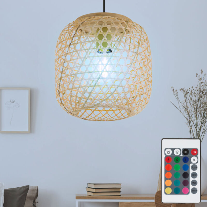 Descrizione Pura natura! Il paralume di questa lampada a sospensione è costituito da una rete di bambù, che permette alla luce di irradiarsi direttamente nell'ambiente. Con un diametro di 23 cm e un'altezza di 135 cm, questa lampada è un ottimo accessorio per la tua casa. Utilizzando il telecomando in dotazione, l'illuminante LED RGB può essere impostato su diversi colori e garantisce così un'illuminazione d'atmosfera. An Illuminante LED RGB con telecomando per luce bianca e controllo RGB è incluso. Details lamp • Tipo di lampada: Lampada a sospensione • Materiale: bambù • Colore: naturale • Cavo in tessuto: nero • Diametro x altezza: 23 x 135 cm • Attacco: 1x E27 • Illuminante incluso: Si • Potenza illuminante: 1x 6 Watt• Flusso luminoso: 1x 470 Lumen• l Colore della luce: bianco caldo• Telecomando: solo per l'illuminante LED RGB • Voltaggio: 230 volt, 50Hz Dettagli Illuminante • Tipo di illuminante: RGB-LED • Attacco: E27 • Materiale: metallo argento, plastica • Colore luce