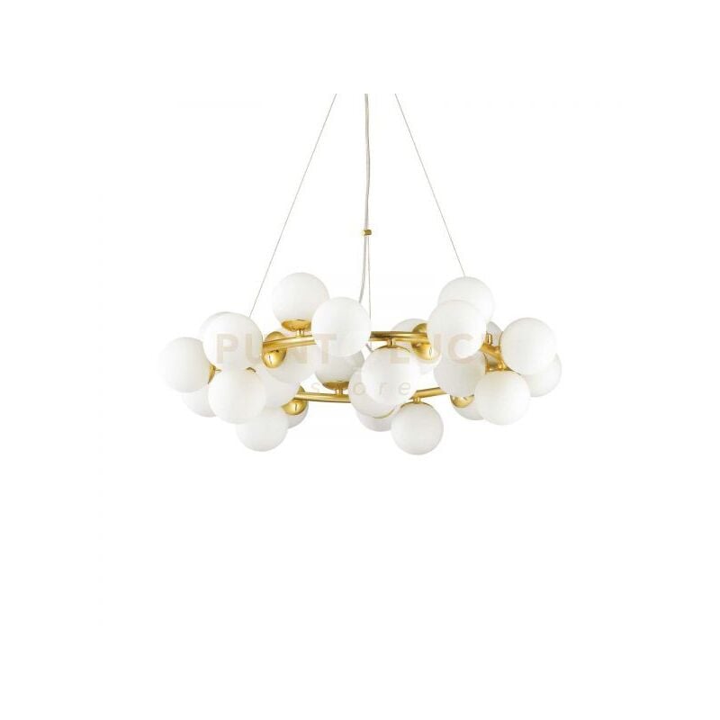 Lampadario a sospensione con rosone e montatura in metallo dorato. Diffusori in vetro incamiciato bianco, soffiato e acidato. Cavi d'acciaio regolabili.
