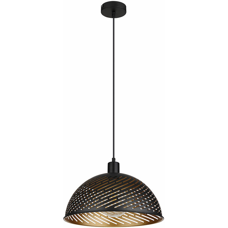 Descrizione Questa moderna lampada a sospensione ispira con il suo bellissimo motivo. Un cavo nero sporge da una staffa a soffitto e conduce a una presa E27 a una profondità di 1,2 m. Il bellissimo paralume nero e oro (Ø36 cm) con grandi punzonature decorative si trova sull'attacco E27, che ti dà anche l'opportunità di determinare tu stesso la tua fonte di luce fino a una potenza massima di 60 watt. La lampadina non è inclusa nella fornitura. Particolare lampada • Tipo di lampada: lampada a sospensione • Materiale: metallo • Colore: nero, oro • Classe di protezione: 2 • Grado di protezione: IP20 • L'altezza può essere accorciata • Diametro x altezza in cm: 36x120 • Presa: 1x E27 • Lampadina inclusa: No • Potenza della lampadina: massimo 1x 60 watt • Alimentazione: 220-230V