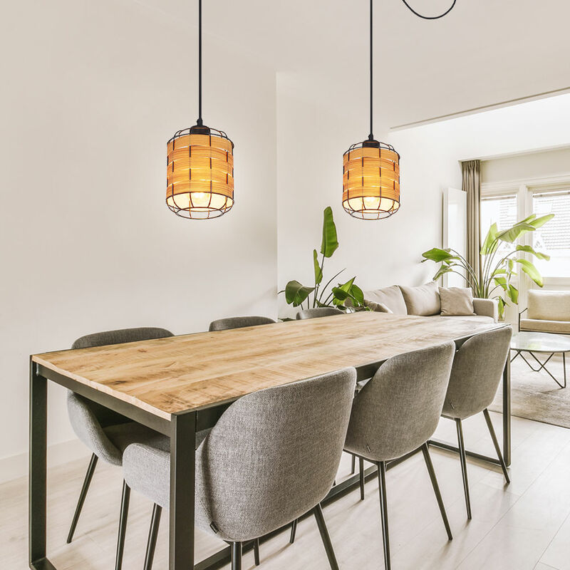 Descrizione Questa fantastica lampada a sospensione ispira con il suo bellissimo design e diventa il punto focale della tua stanza. Un attacco E27 sporge da un cavo tessile nero opaco regolabile in altezza con una lunghezza massima di 2 m, che può essere dotato di una lampadina a scelta fino a una potenza massima di 40 watt. La presa E27 è racchiusa in una gabbia-paralume in metallo rotondo con inserti in plastica e dà così alla luce il giusto tocco. La lampadina non è inclusa nella fornitura. La fornitura include due luci! Particolare lampada • Tipo di lampada: lampada a sospensione • Materiale: metallo, plastica • Colore: nero opaco, effetto legno marrone • Regolabile in altezza con sospensione a cavo • Grado di protezione: IP20 • Classe di protezione: 2 • Diametro x altezza in cm: 15 x 200 • Presa: 1x E27 • Lampadina inclusa: No • Potenza della lampada: massimo 1x 40 watt • Alimentazione: 230V, 50Hz