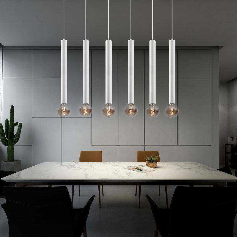 Descrizione Senza tempo, semplice eppure pieno di carattere! Le moderne lampade a filamento LED danno alla lampada a sospensione quel qualcosa in più e donano a ogni stanza un fascino speciale. Sia in cucina che in soggiorno: la lampada è versatile e si abbina facilmente a diversi stili di arredamento. In bianco opaco, la lampada crea accenti luminosi che migliorano visivamente lo spazio abitativo. Le lampadine non sono incluse nella fornitura. Particolare lampada • Tipo di lampada: lampada a sospensione • Materiale: metallo • Colore: bianco opaco • Grado di protezione: IP20 • Classe di protezione: 1 • Regolabile in altezza • Lunghezza x larghezza x altezza in cm: 110 x 9 x 150 • Peso: 5,85 kg • Prese: 6x E27 • Lampadina inclusa: No • Potenza della lampada: 6x massimo 10 watt • Tensione: 230V, 50Hz