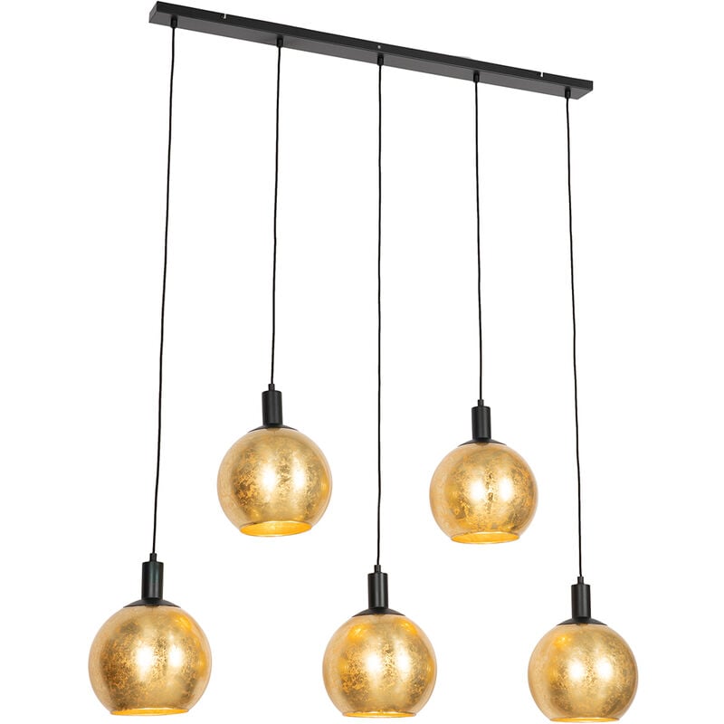 QAZQA Lampada a sospensione di design nera con vetro oro a 5 luci - Bert Ti presentiamo la lampada a sospensione Bert, perfetta per un design o interni moderni. Realizzato in vetro con rivestimento dorato che dona un piacevole effetto caldo. Questa lampada attira davvero l'attenzione. Bert ha cinque punti luce che forniscono luce sufficiente, ad esempio, sopra il tavolo da pranzo. La lampada è lunga 125 cm, larga 25 cm e alta 156 cm ed è possibile accorciarla a 54,5 cm. Ricorda che devi comunque acquistare le sorgenti luminose E27, perché non sono incluse. Bert è anche dimmerabile, quindi puoi scegliere quanta luce desideri (dimmer disponibile separatamente). Bert è davvero una bellissima lampada a sospensione per la tua casa! Portalampada: E27 . Max 5 x 40 W, 230 V Adatto a: LED Voltaggio: 220V/230V IP Classe di protezione: [IP20] A prova di polvere Funzioni extra: Regolabile: Dimmer escluso,No, senza cavo e spina Lampadine exclusiva Il QAZQA Lampada a sospensione di design nera con