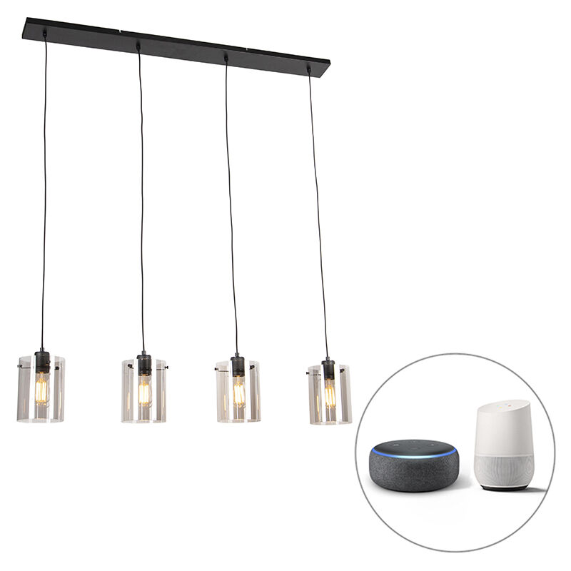 QAZQA Lampada a sospensione intelligente nera con vetro fumé incl.4 Wifi ST64 - Cupola La lampada a sospensione Dome è un vero must per un interno di design. È rifinito in un colore nero e realizzato in vetro con acciaio. La cupola ha un'altezza di 147 cm, una lunghezza di 120 cm e una larghezza di 15 cm. La lampada a sospensione è regolabile in altezza fino a un minimo di 52,5 cm. I 4 punti luce garantiscono un'illuminazione perfetta. Hai dimenticato di spegnere la lampada? Controlla a distanza la tua illuminazione con il tuo smartphone o sistema di casa intelligente. In questo modo puoi anche attenuare facilmente la lampada. Puoi continuare a guardare questa lampada a sospensione: che gioiello è Dome! Portalampada: E27 . Max 4 x 7 W, 230 V Adatto a: LED Voltaggio: 220V/230V IP Classe di protezione: [IP20] A prova di polvere Funzioni extra: Regolabile: Dimmer escluso,No, senza cavo e spina Lampadine inclusiva Il QAZQA Lampada a sospensione intelligente nera con vetro fumé incl.4 Wifi