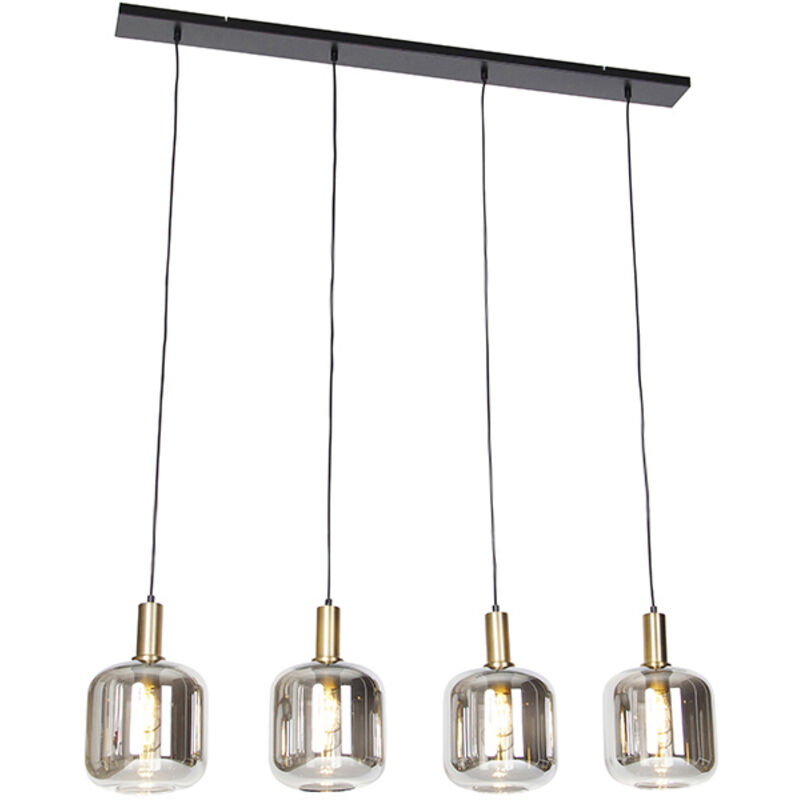 QAZQA Lampada a sospensione intelligente nera con vetro fumé a 4 luci incluso Wifi A60 - Zuzanna Rinfresca i tuoi interni con la lampada a sospensione Zuzanna. Poiché è realizzato in vetro fumé con acciaio ed è rifinito in oro con nero, è un vero must per un interno di design. La lampada a sospensione ha un'altezza di 150 cm, una lunghezza di 120 cm e una larghezza di 21 cm. Inoltre, puoi regolarlo in altezza fino a un minimo di 64 cm. Grazie ai 4 punti luce della Zuzanna, questa lampada a sospensione salta subito all'occhio! Hai dimenticato di spegnere la lampada? Controlla a distanza la tua illuminazione con il tuo smartphone o sistema di casa intelligente. Scegli un'atmosfera extra a casa attenuando la lampada a sospensione. L'aggiunta al tuo interno, Zuzanna! Portalampada: E27 . Max 4 x 4.9 W, 230 V Adatto a: LED Voltaggio: 220V/230V IP Classe di protezione: [IP20] A prova di polvere Funzioni extra: Regolabile: Dimmer incluso,No, senza cavo e spina Lampadine inclusiva Il QAZQA