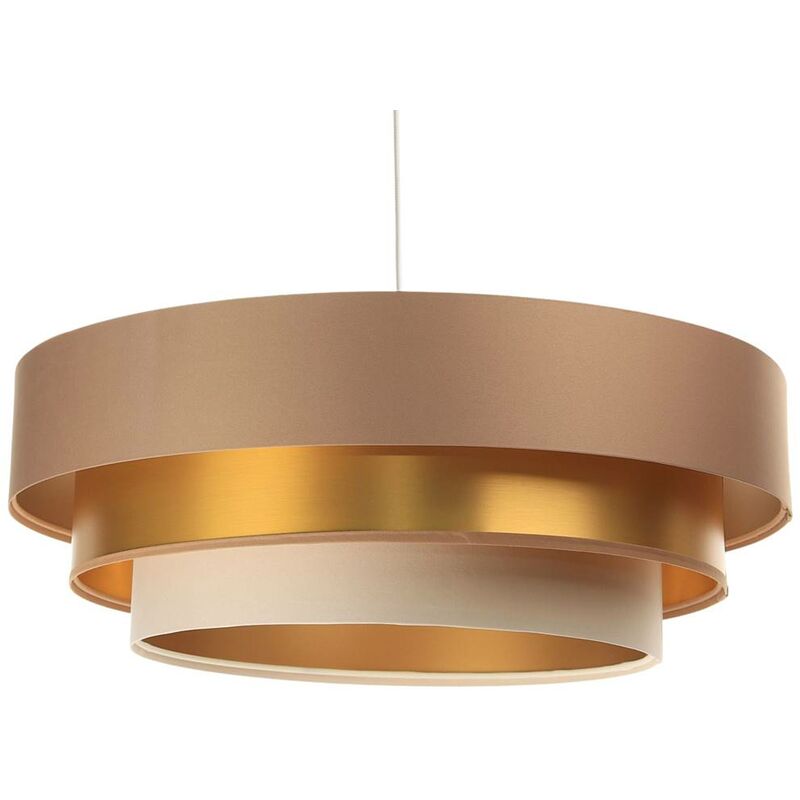 Lampada sospesa Triniti beige/oro 1xe27 H: 102cm Ø 60 cm Dimmable Dimensioni in mm: Altezza: 1020, diametro: 600 Peso in kg: 1.5 lampada contenuta: no Tipo di lampada/versione: e27 Prestazioni massime in Watt: 60 Dimmbar: ja Classe di protezione: ip20 materiale per la casa: metal Colore: bianco Materiale vetro/picking: tessile satinato su colore ombrello a base di ombrello dorato Colore vetro/ombrello: beige/oro Informazioni aggiuntive: cavo di alimentazione nero con lunghezza di 80 cm