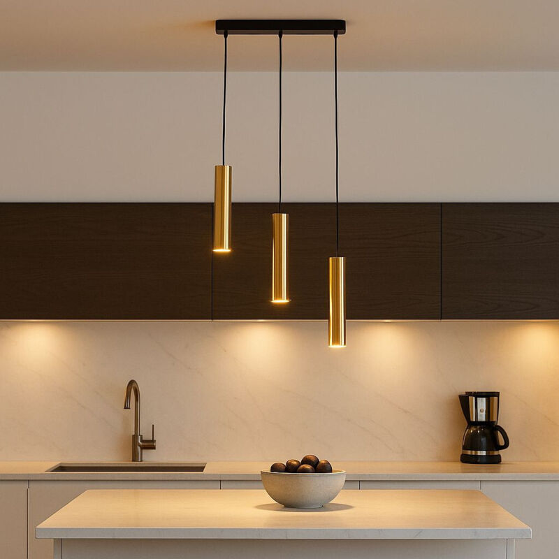 Lampada a sospensione tubolare tripla dal design contemporaneo, realizzata in alluminio, disponibile nei colori nero e ottone. Si distingue per la sua silhouette elegante e semplice, dal carattere minimalista. Dispone di cavi regolabili in altezza che consentono di creare il design che meglio si adatta allo stile di ogni ambiente. **Lampadine GU10 - non incluse**