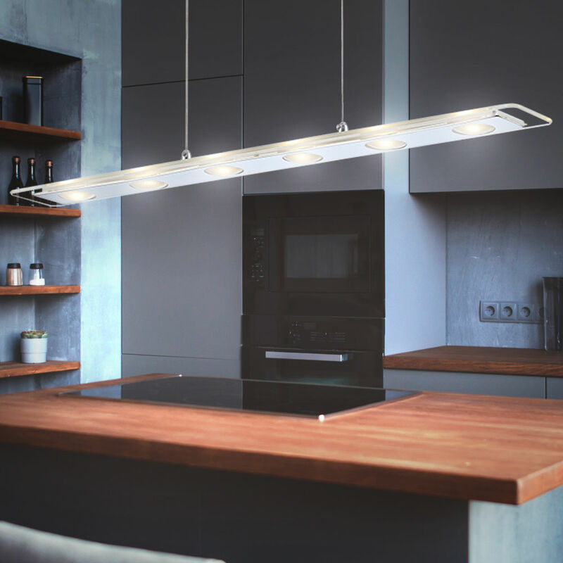 Descrizione Questa elegante lampada a sospensione attira davvero l'attenzione, perché gli elementi in vetro di alta qualità combinati con il cromo dimostrano un gusto moderno e uno stile elegante. Con questa lampada a sospensione potrete aggiungere un nuovo accento alle vostre stanze. Questa lampada sta particolarmente bene sopra la sala da pranzo, il soggiorno o il tavolo della cucina. Grazie alla potente sorgente luminosa, lo spazio abitativo prescelto sarà brillantemente illuminato. Le lampadine a LED sono installate in modo permanente nella lampada. Lampada dettagli • Tipo di luce: lampada a sospensione • Materiale: cromo, vetro trasparente • Lunghezza x larghezza x altezza in cm: 70 x 9 x 120 • Peso: 2,3 kg • Sorgente luminosa: 6x LED • Lampadine LED: 6x 5 watt, 9,3 volt • Flusso luminoso: 2250 lumen (6x 375 lumen) • Colore della luce: bianco caldo • Alimentazione: 220-240V, 50-60Hz Dettagli lampadine • Tipo di lampadina: LED • Flusso luminoso: 375 lm (lumen) • Consumo