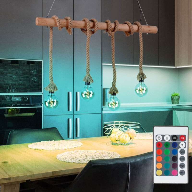 Descrizione Porta lo stile vintage alla moda nella tua zona giorno! La lampada a sospensione colpisce per il suo aspetto impressionante! La corda in combinazione con la trave in legno crea un vero e proprio colpo d'occhio nelle tue quattro pareti. Inoltre, il design marittimo e rustico può essere perfettamente combinato con diversi stili di arredamento. L'illuminante LED RGB può essere commutato sull'utilizzo del telecomando fornito in diversi colori e garantisce così un'illuminazione d'atmosfera. Sono incluse quattro lampadine LED RGB con telecomando per luce bianca e controllo RGB. Dettagli Apparecchio • Tipologia apparecchio: lampada a sospensione• Materiale: legno, corda• Colore: marrone• Grado di protezione: IP20• Lunghezza x larghezza x altezza in cm: 100 x 7 x 120 • prese: 4x E27• lampadine incluse: Sì• potenza lampadine: 4x 6 Watt• flusso luminoso: 4x 470 Lumen• luce Colore: bianco caldo• Telecomando: solo per la lampada• Voltaggio: 220-240V, 50-60Hz Dettagli sorgente luminosa