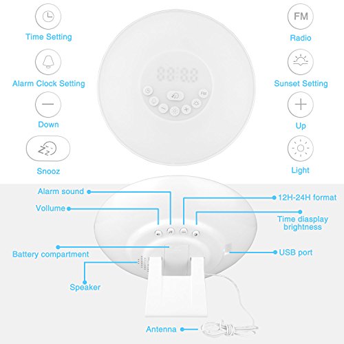 Simulazione alba e tramonto: sotto la modalità sunrise, questo sveglia delle variazioni della luce diventa gradualmente illuminata dall'1% al 100% per farti uscire da un sonno profondo e pronto per un nuovo giorno;