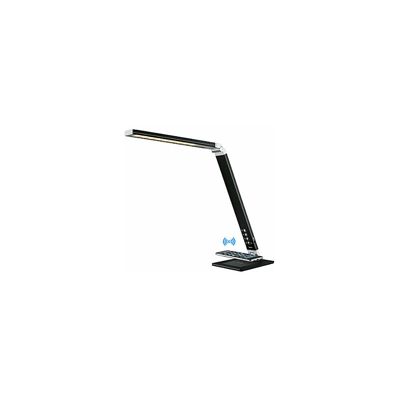 Lampada da scrivania a LED MAGIC PLUS, 500 lumen, dimmerabile, nero. Fornitura = montato. Tipo di prodotto = luci da tavolo. Base della lampada = base. Classe di efficienza energetica per fonte di luce = E (spettro da A a G). Consumo energetico = 10 kWh/1000h. Lampadina = LED. Potenza = 10 Watt. Colore della luce = bianco caldo, bianco giorno. Temperatura di colore = 3000 - 6000 K. Indice di resa cromatica = 80. Luminosità max = 1800 Lux. Flusso luminoso = 500 Lumen. Tensione di alimentazione = 110 - 240 V. Cavo di collegamento = 1.8 m. Durata = 30000 ore. Colore = nero. Caratteristiche = dimmerabile. Dotazione = superficie di ricarica a induzione wireless. Materiale = alluminio, ferro, ABS. Altezza totale = 420 mm. Lunghezza bracci = 365 mm. Superficie di ricarica a induzione magnetica per ricaricare i dispositivi con ricarica wireless. Possibilità di ricarica anche tramite USB (5 V, 2,1 A). Regolazione dell'intensità a 5 livelli sulla testa della lampada e funzione memory. 3 livelli