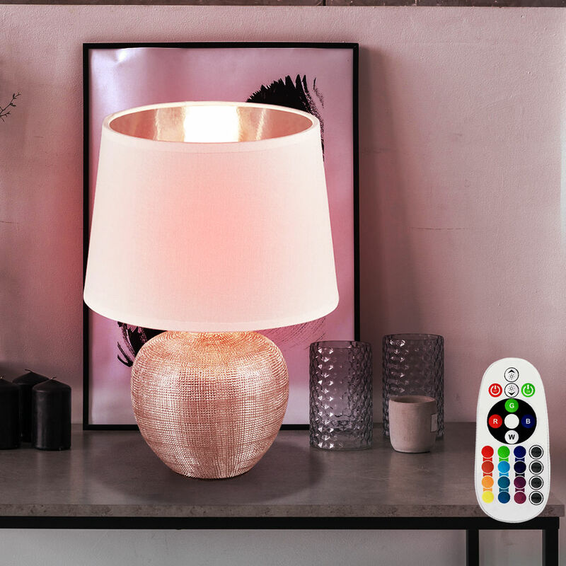 Descrizione Sia su una cassettiera, un tavolino o un comodino, questa lampada da tavolo è un punto culminante elegante. La luce soffusa crea un ambiente lussuoso. Completa perfettamente il tuo stile di arredamento classico ed elegante. La lampada è dotata di un interruttore a filo. È alto 26 cm e ha un diametro di 18 cm. La base argentata e l'interno del paralume bianco sono di gran classe. La lampada diffonde una luce soffusa attraverso l'interno lucido del paralume. L'illuminante LED RGB può essere acceso utilizzando il telecomando in dotazione consente di impostare colori diversi e garantisce così un'illuminazione d'atmosfera. Una lampada LED RGB con telecomando per luce bianca e controllo RGB è inclusa. Dettagli di la lampada • Tipo di lampada: lampada da tavolo• Materiale: ceramica, argento• Paralume: tessuto, bianco-argento• Interruttore a filo• Grado di protezione: IP20• Lunghezza cavo in cm: 150• diametro x altezza in cm: 18 x 26• peso: 0,63 kg • Attacco: 1x E14• Lampadina