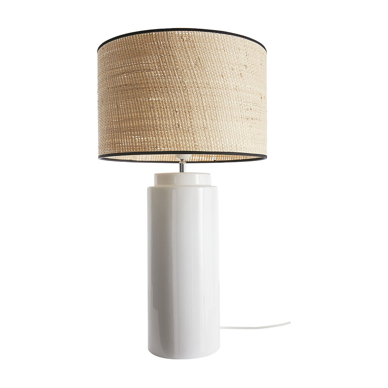 La lampada da tavolo MAJES, l'eleganza della natura nelle nostre case... Con la sua grande base cilindrica in ceramica smaltata e il paralume in rafia naturale, questa lampada da tavolo bianca è frutto di un sapiente gioco di materiali. Un perfetto mix di modernità e autenticità! Particolarmente elegante la bordura in cotone nero che sottolinea la delicatezza del paralume. Con il suo look dalle linee semplici, questa lampada da tavolo fabbricata in Europa si armonizza perfettamente con il resto dell'arredo. Grazie al suo stile e alle generose dimensioni (L35 x L35 x H64 cm), questa grande lampada da tavolo design non mancherà di attirare l'attenzione. MAJES occuperà un posto d'onore in tutta la casa. In una camera da letto un pizzico bohémien, sarà perfetta accanto a una testata letto in rattan sapientemente lavorato, oppure in un salotto dalle influenze etno-chic. Questa lampada da tavolo di tendenza troverà elegantemente posto su una credenza in legno massello. Grazie al paralume