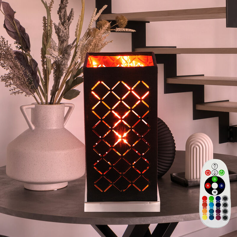 Descrizione La lampada da tavolo quadrata (10x10 cm) di questa serie di modelli colpisce per il suo design individuale ed elegante. La lampada da tavolo alta 25 cm è costituita principalmente da un tessuto nero decorato con eleganti punzonature decorative, che è rivestito all'interno con foglia d'oro Questa lampada da interno è dotata di un attacco E14, che permette di determinare la fonte di luce voi stessi (max .40W) per decidere l'intensità della luce e il colore della luce. Consigliamo lampade a LED per il loro risparmio energetico e la loro longevità L'interruttore on/off standard e il cavo di collegamento lungo 1,5 metri le rendono flessibili da usare. Altre lampade della stessa serie di modelli potrebbero completare il quadro nella tua zona. Una lampada LED RGB di alta qualità a risparmio energetico con telecomando per luce bianca e controllo RGB sono inclusi nella consegna. Dettagli lampada • tipo di lampada: lampada da tavolo• Materiale: nichel opaco• Paralume: tessuto