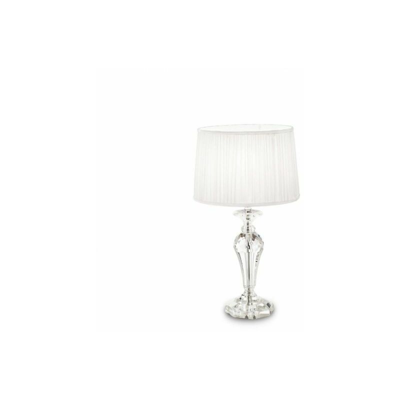 Lampada da tavolo con corpo luce con elementi di cristallo trasparente molato. Paralumi in tessuto doppio, plissettato.