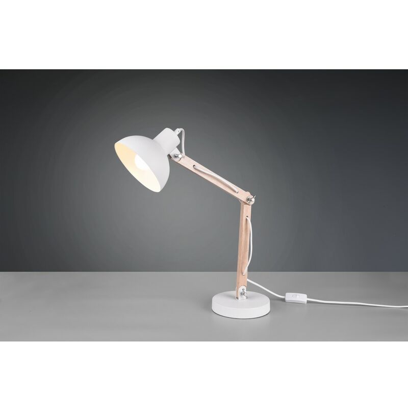 Lampada da Tavolo Kimi Legno e Paralume Bianco La lampada da tavolo KIMI di Trio Lighting presenta una struttura in metallo finitura bianco opaco con braccio in legno flessibile grazie allo snodo, interruttore a filo incluso. E' possibile installare lampadina E27 max 42 watt (acquistabile separatamente). Una lampada semplice e versatile, ideale per arredare e illuminare con stile diverse stanze della vostra casa, come ad esempio la zona living o la camera da letto. Disponibile anche la variante nella finitura nera. Caratteristiche: Struttura in metallo finitura bianco opaco Braccio in legno flessibile Interruttore a filo incluso Potenza massima lampadina: E27 max 42 watt Disponibile anche nella finitura nera