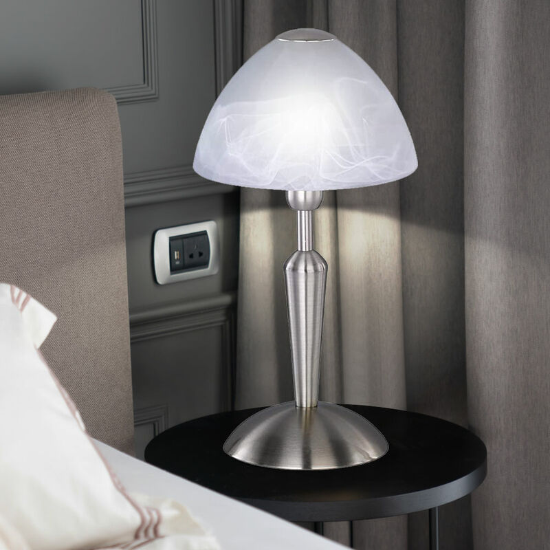 Descrizione Questa lampada da tavolo promette una luce radiosa. Migliora il tuo spazio abitativo con questa elegante lampada da tavolo e dagli un nuovo tocco. Con l'aiuto dell'illuminante appropriato, lo spazio abitativo prescelto viene illuminato in modo brillante. Questa lampada si adatta perfettamente al comodino o al tavolo da lavoro. Una lampadina a LED è inclusa nella fornitura. Particolare lampada • Tipo di lampada: lampada da tavolo • Materiale: metallo, vetro • Colore: argento, alabastro • Grado di protezione: IP20 • Interruttore a cavo • Dimensioni diametro x altezza in cm: 17,5 x 33 • Lampadina: 1x E14 • Lampadina inclusa: sì • Potenza della lampada: 1x 5,5 watt • Flusso luminoso: 1x 470 lumen • Colore della luce: bianco caldo • Alimentazione: 230 volt, 50 Hz Dettagli lampadine • Tipo di sorgente luminosa: LED • Attacco: E14 • Flusso luminoso: 470 lumen • Consumo energetico nominale: 5,5 watt • Rispetto alla lampadina a incandescenza: 5,5 = 40 watt • Risparmio energetico