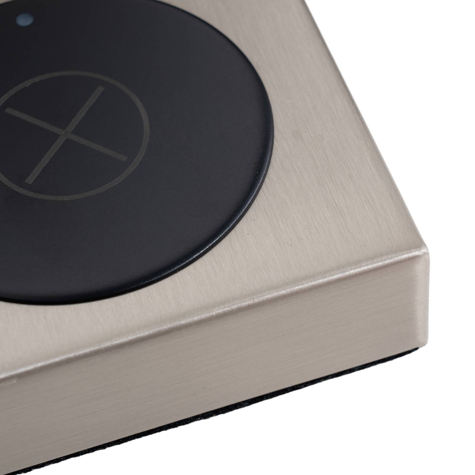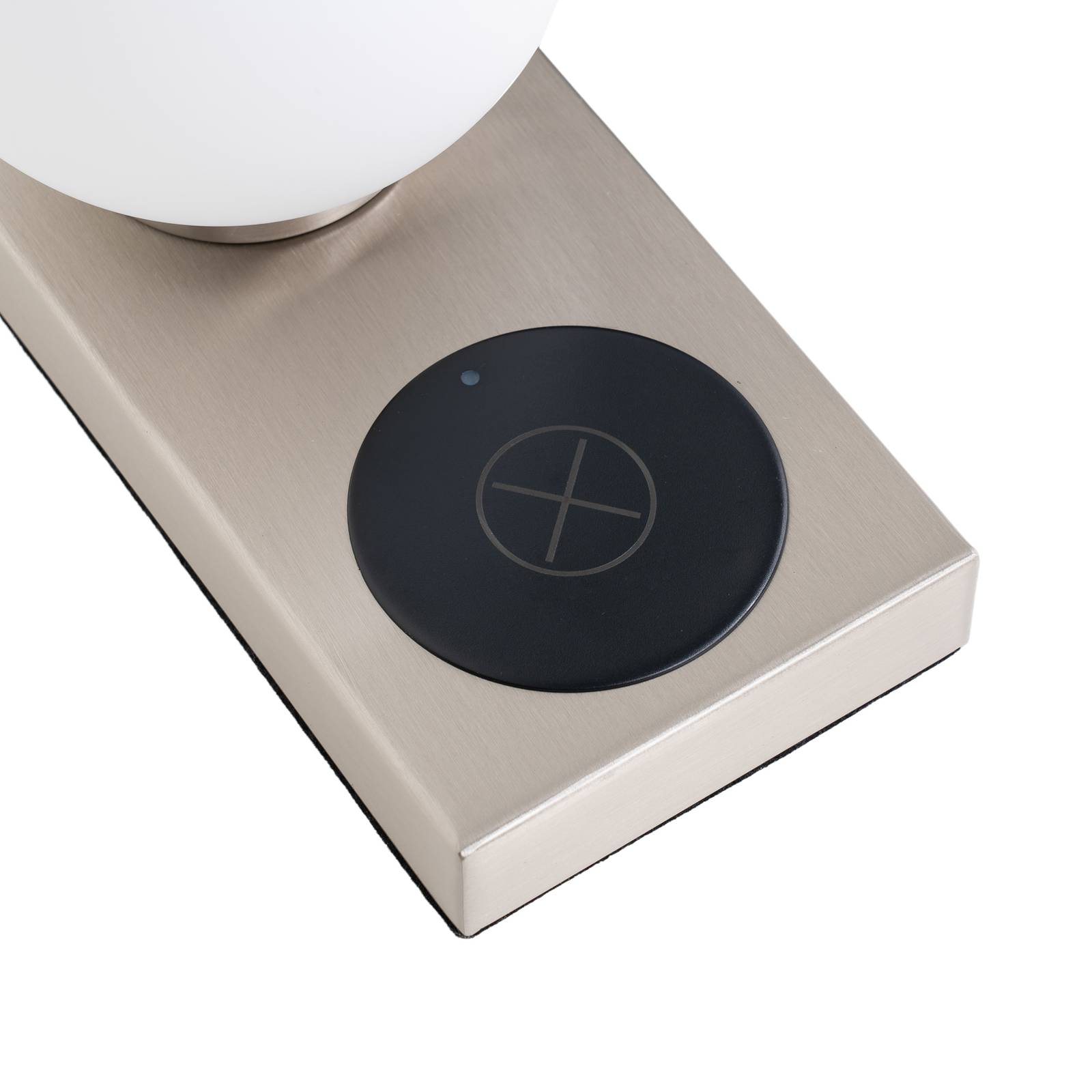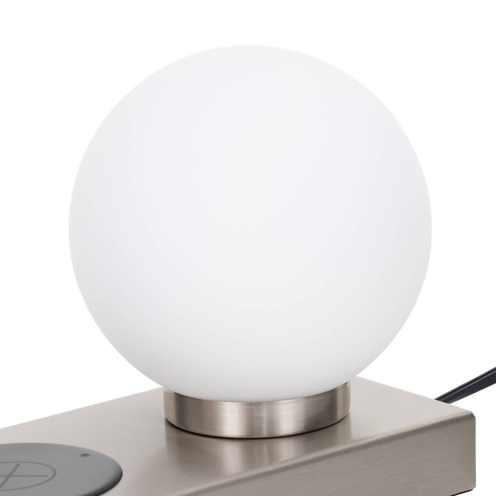Lampada da tavolo Junis con paralume in vetro e funzione di ricarica Grazie al suo design moderno, la lampada da tavolo Junis si integra perfettamente in diversi ambienti. La struttura angolare è in metallo ed è completata da un paralume rotondo in vetro la cui superficie opalina illumina l'ambiente circostante senza abbagliare. La lampada da tavolo può essere posizionata in modo flessibile nella zona giorno, ad esempio in camera da letto, nel corridoio o nel soggiorno. Particolarmente pratica: sulla struttura, accanto al paralume in vetro, è presente una superficie di contatto su cui è possibile appoggiare dispositivi compatibili, come gli smartphone, e caricarli senza bisogno di un cavo aggiuntivo (uscita massima 5V/1A).