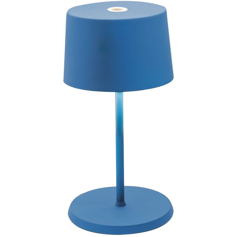 Lampada a led da tavolo Olivia pro mini ricaricabile e dimmerabile con batteria incorporata da 2,2 watt. . Lampada a led da tavolo con corpo in alluminio verniciato color blu capri, diffusore in policarbonato e fonte luminosa a led di 144-150 lumen. La batteria di Olivia pro mini ha una durata di circa 9 ore. Batteria ricaricabile tramite base a contatto presente nella confezione . La lampada a led da tavolo Olivia Mini presenta sulla sommità del diffusore il pulsante touch di accensione della lampada che tenendolo premuto permette di regolare l'intensità luminosa da 2700K a 3000K . Mantiene la memoria dello step di dimmerazione e, alla successiva accensione, l'intensità luminosa corrisponderà a quella precedentemente impostata. Olivia Mini è una lampada a led da tavolo ideale da utilizzare nei bar, ristoranti e dehors, si utilizza molto anche nelle abitazioni, nelle camere da letto, nei salotti e negli studi professionali. Lampada a led da tavolo di design. La collezione Olivia pro