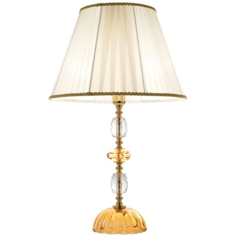 Lampada da tavolo PATRICIA realizzata in vetro e cristallo ambra con montatura in metallo rifinito oro. Paralume in organza e ponge'. Un elemento dalle linee raffinate e preziose, ideale per illuminare e al tempo stesso arredare con particolare eleganza salotti e soggiorni in perfetto stile classico-contemporaneo. CARATTERISTICHE Colore: Ambra Materiale: Metallo, vetro Tipologia: Lampada da tavolo Modello: Grande Altezza: 66 cm Diametro: 40 cm Dimmerabile: No Illuminazione: 1 x E27 ( L'attacco E27 permette di installare lampadine a LED, fluorescenti o alogene non incluse ) Input: 220-230V