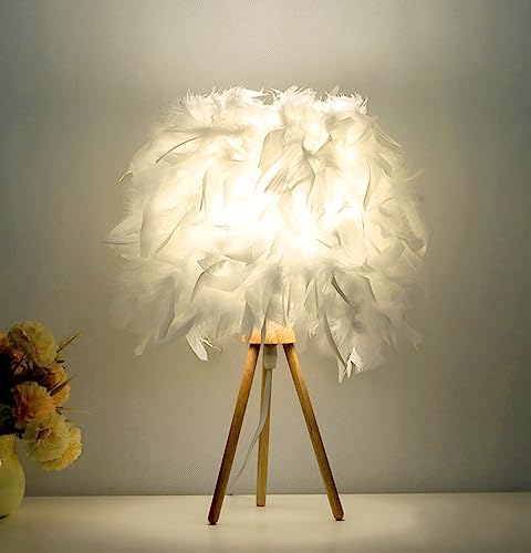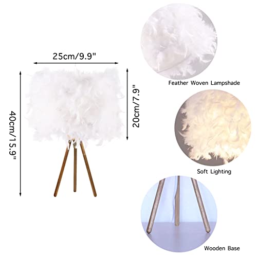 Lampada da tavolo in piuma bianca Lampada da comodino con base triangolare in legno Lampada da tavolo in piuma con paralume da scrivania per lampada da camera, lampada decorativa, soggiorno