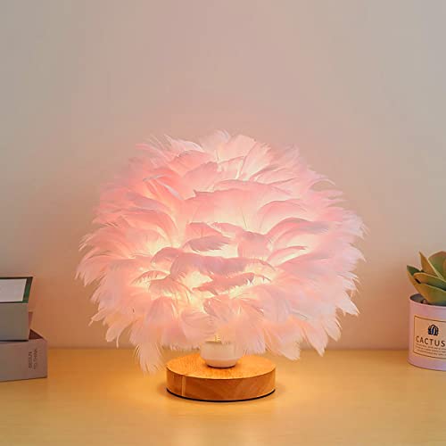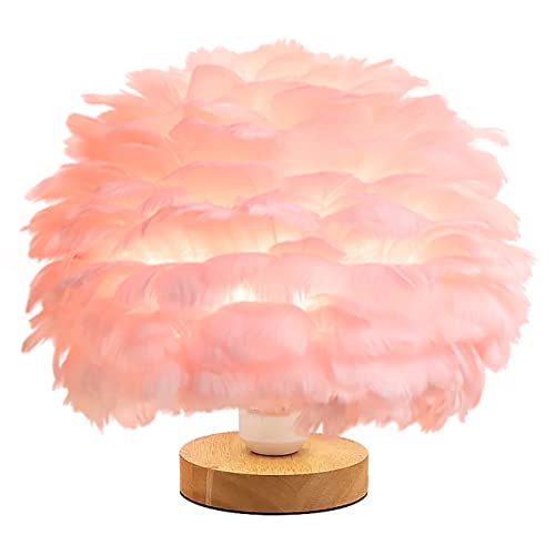 Lampada da tavolo in piuma rosa Lampada da comodino con base in legno Lampada da tavolo in piuma con paralume da scrivania per lampada da camera, lampada decorativa, soggiorno