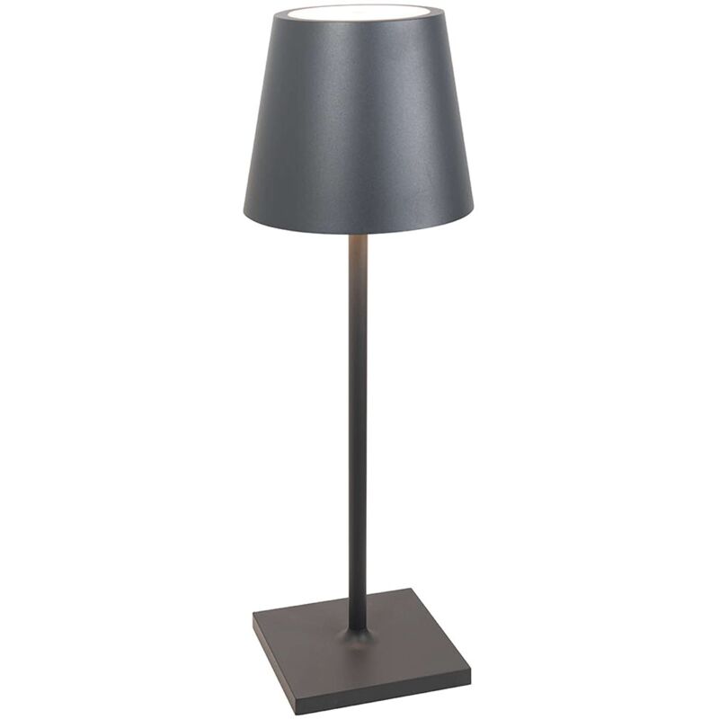 Lampada a led da tavolo Poldina L desk grigio scuro ricaricabile e dimmerabile con batteria incorporata da 5,5watt. La batteria della Poldina L desk ha una durata garantita di 11 ore alla massima potenza. Batteria ricaricabile tramite base di contatto inclusa nella confezione. La lampada a led da tavolo Poldina L desk presenta un corpo in pressofusione di alluminio verniciato grigio scuro e schermo diffusore policarbonato. Poldina L desk presenta sulla sommità un controllo touch che permette di accendere la lampada, regolare l'intensità luminosa e scegliere la colorazione di luce tra 2200K,2700K e 3000K con un flusso luminoso di 479,540 e 550 lumen. Poldina L desk è una lampada di design ideale da utilizzare negli studi professionali, negli uffici e nei salotti. Lampada a led da tavolo di design. La collezione Poldina L desk ha un grado di protezione IP54 che la rende adatta sia all'uso interno che esterno. Da soli o in compagnia, fedele complice per più di 11 ore Dimensione: Ø16,5 x