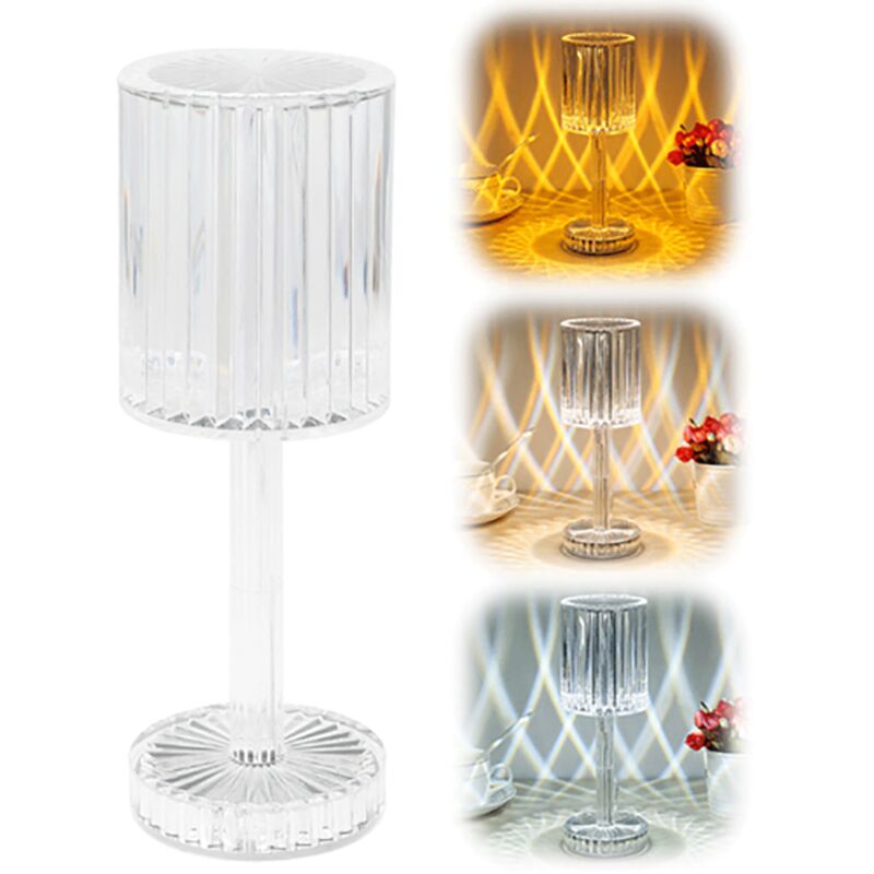 Lampada da tavolo in stile classico/moderno realizzata in plexiglass acrilico con effetto cristallo. Questa abatjour ha una batteria integrata ricaricabile tramite cavo usb in dotazione, ha il pulsante di accensione touch e sul retro l'ingresso per la ricarica. La particolarità di questa lampada è che si possono selezionare 3 colori, bianco freddo, bianco caldo, bianco naturale semplicemente pigiando il tasto touch I led sono integrati e quindi non sostituibili per un potenza di 0,5W per la calda e luce fredda e 1w per la luce naturale il che permette alla lampada di creare un atmosferica romantica Fantastica scelta ed ideale per l'illuminazione decorativa di camera da letto, soggiorno, da appoggio all'ingresso della vostra casa o per tavoli di locali, pub, bar e ristoranti, lidi alla sera. Con piccoli touch cambi colore. MAGGIORI INFORMAZIONI Caratteristiche principali: Ha un altezza di 25 cm e un angolo di illuminazione di 120° . La batteria interna ha un tempo di ricarica di circa