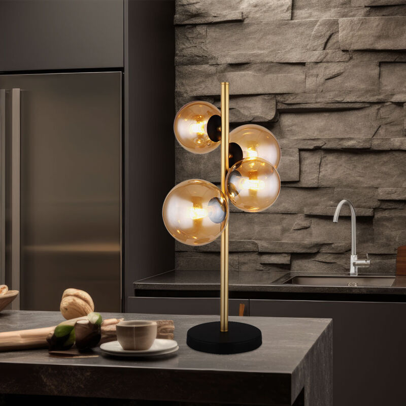 Descrizione Questa affascinante lampada da tavolo colpisce per il suo fantastico design. Un'asta metallica di 48 cm in bellissimo ottone sporge da una base rotonda nera opaca, dotata di quattro lampadine LED G9 di diverse dimensioni e ciascuna con un paralume in vetro ambra. Le lampadine LED G9 emettono una luce bianca calda da 3000 Kelvin e creano così un'atmosfera piacevole. Puoi completare perfettamente la tua zona giorno con gli altri modelli di questa serie. Nella fornitura sono incluse quattro lampadine LED. Lampada dettagli • Tipo di lampada: lampada da tavolo • Materiale: metallo, vetro • Colore: ottone, ambra, nero • Grado di protezione: IP20 • Classe di protezione: 2 • Lunghezza x larghezza x altezza in cm: 23,7x19,3x48 • Prese: 4x LED G9 • Lampadine incluse: sì • Potenza lampada: 4x 3,5 watt • Flusso luminoso: 4x 350 lumen • Colore della luce: bianco caldo • Voltaggio: 230 V, 50 Hz Dettagli lampadine • Tipo di lampadina: LED • Attacco: G9 • Flusso luminoso: 350 lm (lumen)