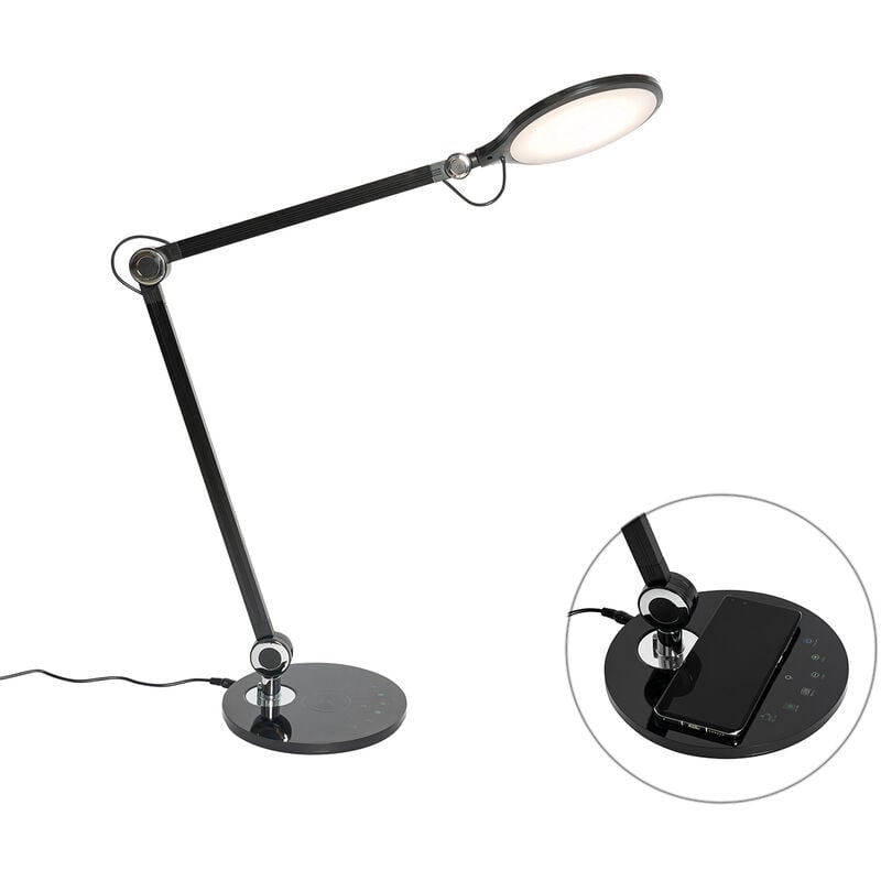 QAZQA Lampada da tavolo di design nera con LED con touch e caricatore a induzione - Don La lampada da tavolo Don è un vero e proprio colpo d'occhio per un interno moderno! La lampada è realizzata in plastica ed è di colore nero. L'illuminazione a LED della lampada è integrata nel dispositivo. L'altezza della lampada è di 49,7 cm, la lunghezza è di 20,1 cm e la larghezza è di 55,7 cm, ed è facile da regolare. La luce LED ha una potenza di 10 watt e dura in media 30.000 ore di accensione. Con un massimo di 600 lumen, questa è una lampada davvero potente! Don è dotata di un cavo e una spina, con una lunghezza del cavo di 130 cm. È possibile regolare l'intensità della luce di questa lampada da tavolo con il dimmer touch nella base. Inoltre, nella base è presente una ricarica a induzione con cui è possibile ricaricare lo smartphone. Con Don, porterai sicuramente una fantastica lampada da tavolo nella tua casa! Portalampada: (non sostituibile) LED . Max 1 x 10 W, 230 V Adatto a: LED