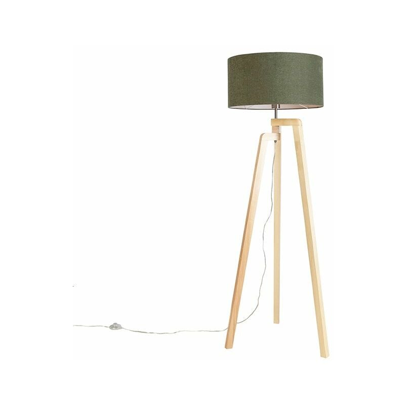 QAZQA Lampada da terra legno paralume verde 50 cm - PUROS Con la treppiede Puros, puoi creare un oggetto unico ed elegante nella tua casa! Il legno e la forma asimmetrica delle gambe le conferiscono un tocco in più. Il colore verde muschio del paralume le dona un tocco naturale, che la rende perfetta per lo stile di vita botanico. Il paralume ha un diametro di 50 cm e un'altezza di 25 cm. La lampada ha un'altezza totale di 145 cm. L'articolo è dotato di cavo e spina con una lunghezza di 320 cm. La lampada può anche essere smorzata con un dimmer esterno (dimmer non incluso);