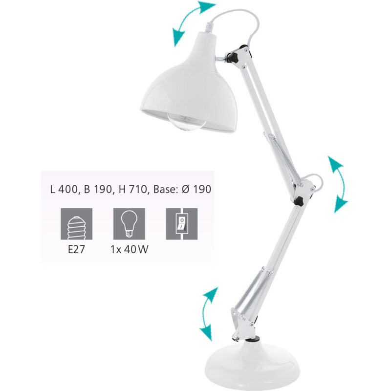Lampada da scrivania lampada BORGILLIO in bianco, E27 max 1X60W Altezza: 71 centimetri Eglo Il tavolo e lampade da terra della serie BORGILLIO portare il popolare aspetto industriale nella vostra casa. BORGILLIO Dimensioni: Lunghezza: 400 millimetri larghezza: 190 millimetri altezza: 710 millimetri Ø di base: 190 millimetri peso netto: 3.406 kg lampada inclusa: no tubero: E27 max, Watt della lampada: 1X60W Light dimmerabile: NO luminosità in lumen: - temperatura di colore in Kelvin: - Classe di efficienza energetica: A ++ a E protezione: interruttore: SI sensore: no commutabile Profilo: si ulteriori informazioni: cavo di scatto