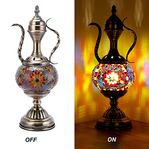 Lampada da tavolo in vetro a mosaico turco Teiera Marocchina Lanterna Decorativa Tiffany Style Scrivania Luce notturna per camera da letto, soggiorno, tavolino (rosso)