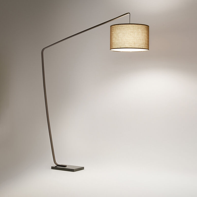 Piantana in alluminio verniciato a polveri con paralume in tessuto plastificato e base in marmo. Cavo in tessuto a vista.