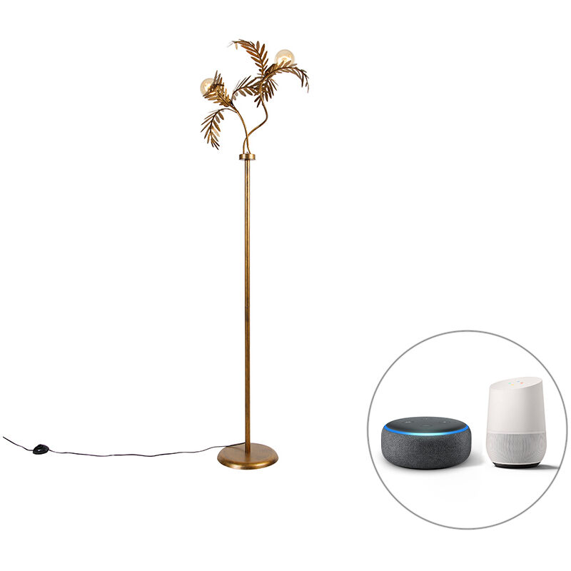 QAZQA Lampada da terra intelligente oro a 2 luci con Wifi G95 - Botanica La lampada da terra Botanica è un vero e proprio colpo d'occhio per un interno rustico! La lampada è realizzata in acciaio ed è dorata. Grazie ai 2 punti luce della Botanica, questa lampada da terra si distingue immediatamente! La lampada ha un diametro di 50 cm e un'altezza di 187 cm. Grazie all'elevata emissione luminosa fino a 806 lumen, la lampada da terra è adatta per l'illuminazione funzionale. La temperatura di colore della lampada varia da 1.800K a 3.000K. Hai dimenticato di spegnere la luce? Controlla l'illuminazione da remoto con lo smartphone o il sistema di casa intelligente. Questa lampada è dotata di cavo e spina. Il cavo è lungo 260 cm. Botanica è dimmerabile, il dimmer non è incluso. Ciò ti consente di determinare l'atmosfera che desideri creare attenuando la lampada da terra. Non esitare più e scegli Botanica! Portalampada: E27 . Max 2 x 4.9 W, 230 V Adatto a: LED Voltaggio: 220V/230V IP Classe