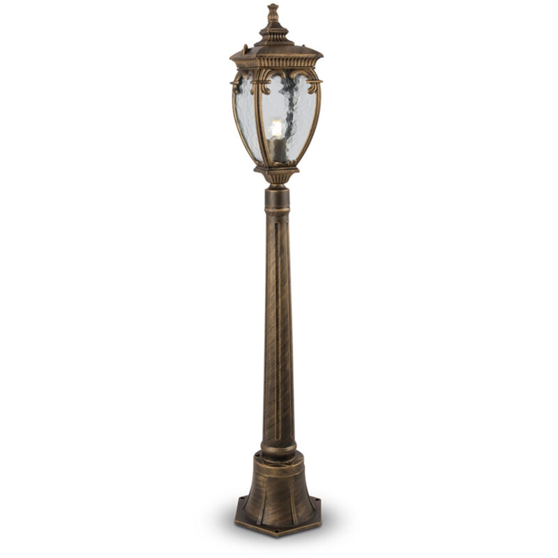 Collezione Outdoor UN TOCCO CLASSICO AL TUO AMBIENTE Lampada da Terra per esterno Classico Fleur 1 luce E27 60W corpo in Alluminio Oro K IP 44 A++ D.15 x H.113 cm. ll corpo in alluminio di due tonalità: nero con oro e bronzo antico. Il diffusore in vetro PULEGOSO. La vasta gamma: le lampade da esterno a sospensione, da parete e da terra.