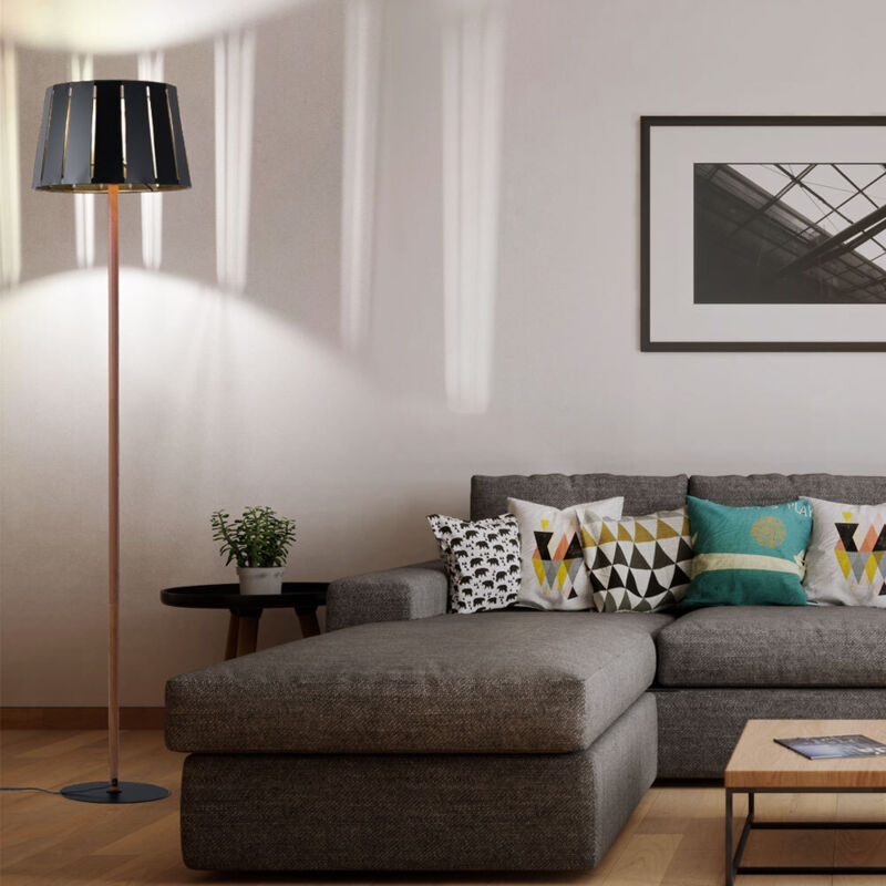Descrizione Semplice ma moderno, questo è il motto di questa lampada da terra. Un bellissimo paralume decorativo (Ø35 cm) in nero opaco copre la presa E27, che si trova in cima a un palo di legno di 1,6 m. L'attacco E27 ti consente di scegliere liberamente le tue lampadine fino a una potenza massima di 40 watt. La lampadina non è inclusa nella fornitura. Particolare lampada • Tipo di lampada: lampada da terra • Materiale: metallo • Colore: nero, effetto legno • Interruttore a pedale • Grado di protezione: IP20 • Classe di protezione: 2 • Diametro x altezza in cm: 35 x 160 • Presa: 1xE27 • Lampadina inclusa: No • Potenza della lampada: 1x massimo 40 watt • Alimentazione: 230V, 50Hz