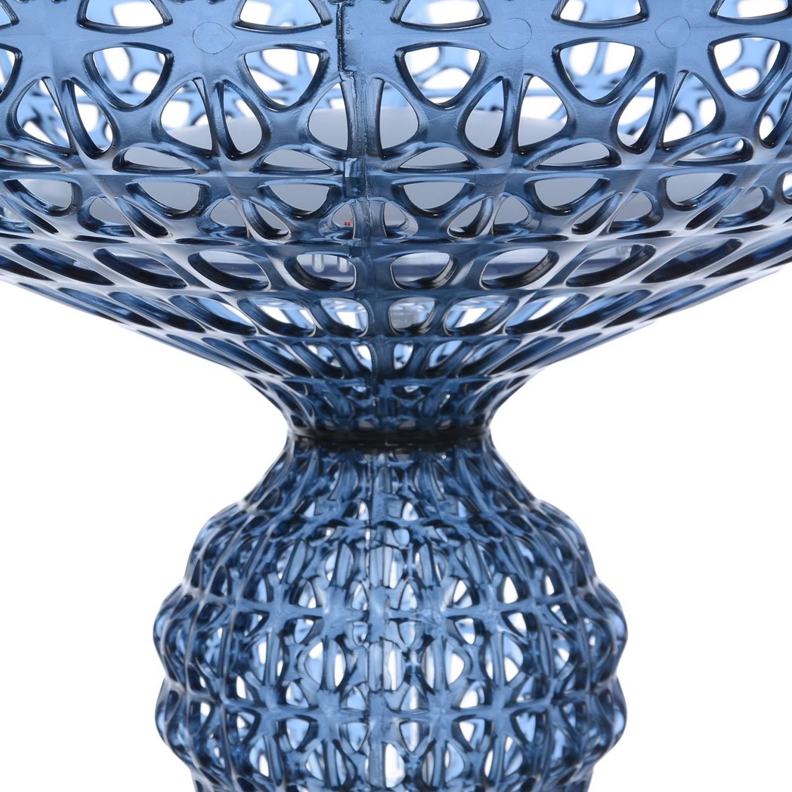 Lampada da terra LED di design Kabuki, dimmerabile, di marca Kartell Il profilo rimanda a un opulento lampione di epoca barocca. Il design di questa lampada da terra LED coniuga spiritosamente uno stile classico con la tecnica e i materiali più moderni. Se la struttura sembra di pizzo, in realtà la lampada non è fatta di tessuto bensì di tecnopolimero termoplastico stampato a iniezione. I forellini nel paralume generano interessanti giochi di luci ed ombre nel momento in cui si accende la lampada. La serie Kabuki è firmata dall'architetto e designer Ferruccio Laviani per il marchio milanese Kartell. La plastica in tutte le sue forme e colori è il materiale di cui sono fatti i capolavori di design che hanno reso celebre Kartell negli ultimi decenni. Molti oggetti firmati da Kartell sono ormai diventati dei classici, esposti in diversi musei moderni.
