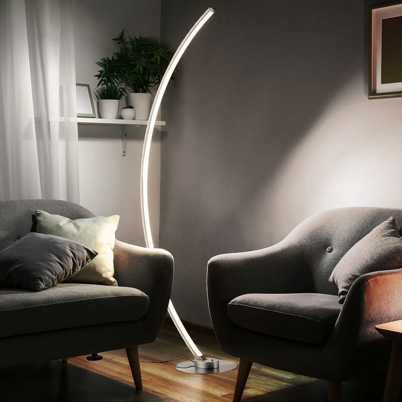 Descrizione Con il suo design moderno in acciaio e la forma curva, la lampada da terra a LED è un punto culminante nella tua casa. Posiziona la lampada da terra nel tuo soggiorno come lampada da lettura o come luce d'atmosfera in camera da letto. La lampada contiene molte caratteristiche impressionanti, come la tecnologia di illuminazione anteriore e posteriore. Ciò consente di illuminare la luce principale (luce anteriore) nella temperatura di colore da bianco caldo a bianco diurno grazie al CCT. Allo stesso tempo è possibile che la luce di fondo (retroilluminazione) brilli in colori diversi a causa del cambio di colore RGB. Puoi utilizzare il telecomando in dotazione per azionare la lampada da terra a LED comodamente dal tuo divano. Oltre alle modalità colore, la lampada è dimmerabile, quindi puoi regolare la luminosità a tuo piacimento e alle tue esigenze. Puoi anche accendere e spegnere la lampada da terra utilizzando un classico interruttore a pedale. L'illuminante è installato