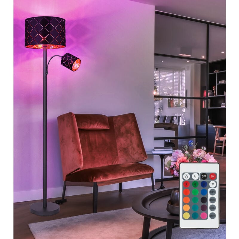 Descrizione Semplice ed elegante! Con il suo aspetto semplice ma bello, questa lampada da terra si adatta perfettamente a qualsiasi spazio abitativo. Con un'asta in metallo nero, così come i due paralumi in velluto nero con punzonature decorative e la parte interna color oro, puoi mettere questa lampada sotto i riflettori ovunque. La luce da lettura può essere facilmente piegata nella direzione desiderata utilizzando il braccio Flexo, garantendo così un'illuminazione ottimale nell'area desiderata. L'uplighter e la lampada da lettura possono essere accesi separatamente l'uno dall'altro, in modo da dover accendere solo la luce effettivamente necessaria. Utilizzando il telecomando in dotazione, l'illuminante LED RGB può essere impostato su diversi colori e garantisce così un'illuminazione d'atmosfera. Nella fornitura sono incluse due lampadine LED RGB con telecomando per luce bianca e controllo RGB. Particolare lampada • Tipo di lampada: lampada da terra • Materiale: metallo, nero