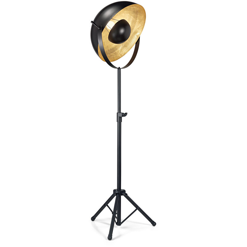 Collezione Stage ORIGINAL LAMPS Piantana a 1 luce con corpo luce in metallo rifinito con vernice nera opaca. Treppiede con asta telescopica regolabile in altezza. Diffusore orientabile, decorato internamente in foglia oro.