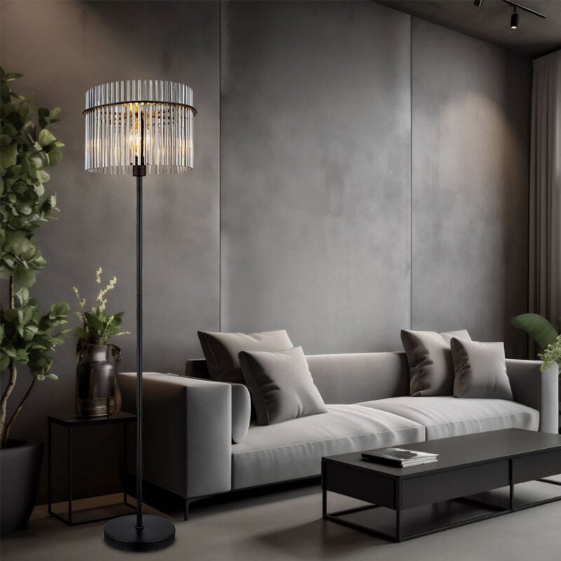 Descrizione Scopri l'elegante lampada da terra e inonda la tua casa di una luce suggestiva. Con il suo design elegante in metallo nero opaco e aste in vetro fumé attirerà l'attenzione in ogni stanza. Dispone di un resistente cavo in PVC nero con un pratico interruttore a pedale per un comodo utilizzo. Con un diametro di 38 cm e un'altezza di 152 cm, offre una presenza impressionante. Il cavo lungo 180 cm consente opzioni di posizionamento flessibili. La presa E27 consente di determinare autonomamente il colore della luce e la luminosità fino a una potenza massima di 60 Watt. Dai al tuo spazio abitativo quel tocco di stile e atmosfera in più. La lampada non è inclusa nella fornitura. Lampada dettagli • Tipo di lampada: lampada da terra • Materiale: metallo, bacchette di vetro • Colore: nero opaco, fumé • Cavo in PVC nero • Interruttore a pedale nel cavo • Grado di protezione: IP20 • Classe di protezione: 2 • Lunghezza cavo in cm: 180 • Diametro x altezza in cm: 38 x 152 • Attacco: 1x